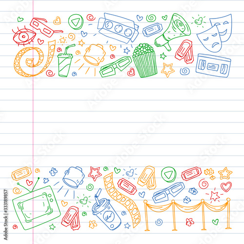 © Anastasia, Fototapeta premium Online internet cinema pattern with vector icons for wrapping paper, posters, banners, leaflets. 3d movie, tv, musical.
