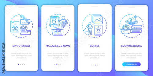 Fototapeta premium Online library catalogue onboarding mobile app page screen with concepts. DIY Tutorials, cooking books walkthrough 4 steps graphic instructions. UI vector template with RGB color illustrations