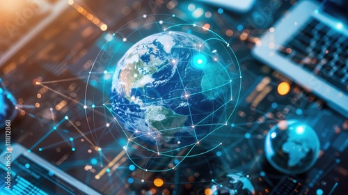 Obraz premium Online Network: Globe surrounded by digital devices symbolizing internet connectivity.