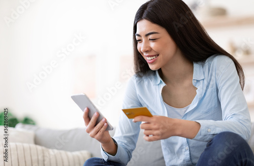 Fototapeta premium Online Payment. Smiling Asian Woman Using Smartphone And Credit Card At Home