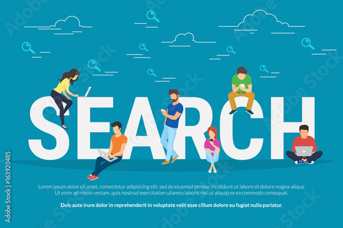 © Julia Tim, Obraz premium Online searching concept vector illustration of young people using mobile smarthone and laptop for searching info in web browser. Flat design of guys and young women on letters with magnifier symbols