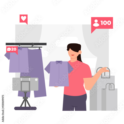 Fototapeta premium Online Shopping and E-Commerce Illustration. Fashion Sale, Mobile App, Influencer Marketing, and Product Review Concept in Flat Style