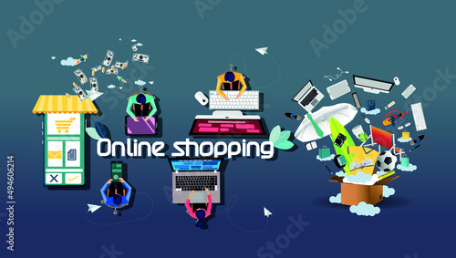 © Nattanee Srisuk, Naklejka premium Online shopping with Ordering, Pay, Product delivery - Creativity modern Idea and Concept illustration vector.