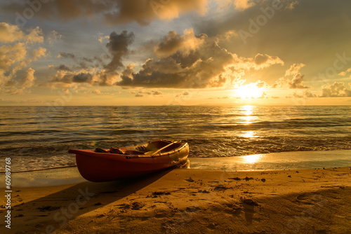 © smoothz911, Fototapeta premium Onshore kayak boat with sunset in the background