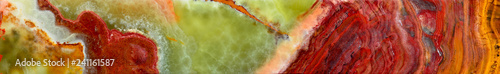 © lubov1234, Fototapeta premium Onyx to różnorodny agat. Tekstura powierzchni pięknego kamienia. Zielony, brązowy, czerwony, biały, żółty kolor plam na minerale półszlachetnym. Widok panoramiczny