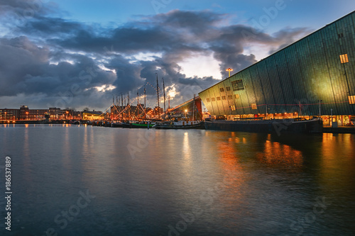 © julia700702, Obraz premium Oosterdok canal in Amsterdam with Nemo Science Museum on the right and historical commercial ships in the middle