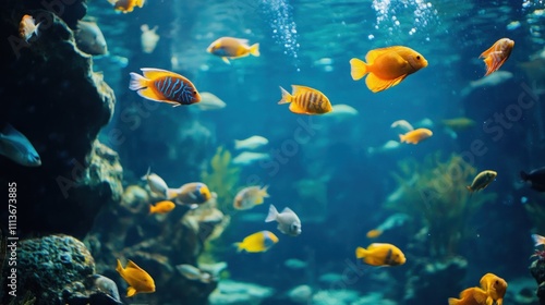 Fototapeta premium op view, home aquarium with tropical fish, rectangle shape, 4K, HD pictures.