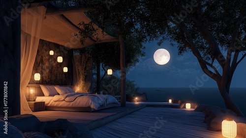 © Kokhanchikov, Fototapeta premium Open air canopy bed on wooden deck at night with full moon and ocean view