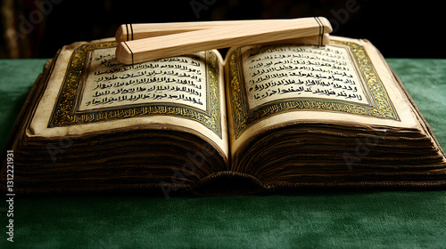 © muhaimin, Fototapeta premium Open ancient book with wooden pointers on green cloth.