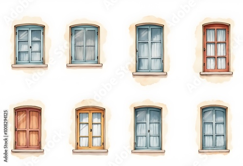© Mahmudul, Fototapeta premium Open and closed windows with colorful wooden shutters. Mediterranean style in architecture. Isolated on a white background. Set, collage. Square format.