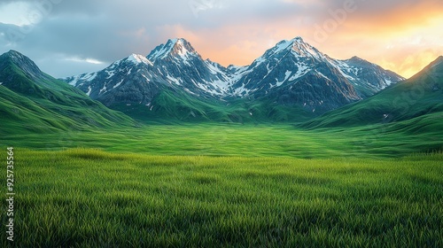 Fototapeta premium Open and flat green grasslands, snow capped mountains, dusk, rich colors,...