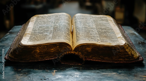 © muhaimin, Obraz premium Open antique bible on dark surface