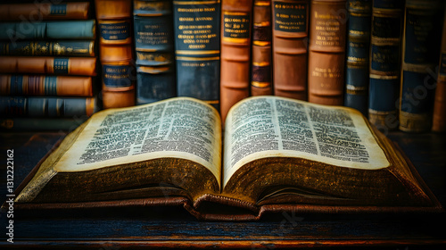 Obraz premium Open antique book in library setting