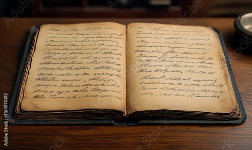 © alisya, Obraz premium Open antique book with aged pages and handwritten text on wooden table.