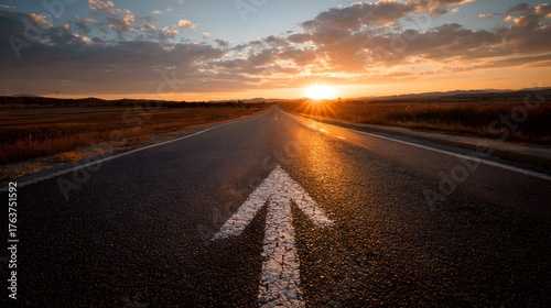 Naklejka premium Open asphalt highway stretches toward a brilliant sunset over open terrain