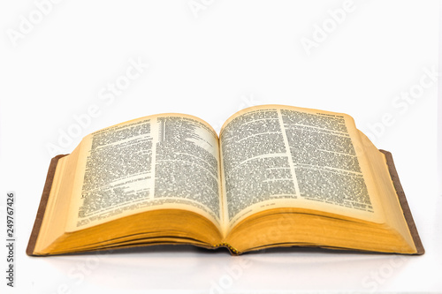© Richard, Fototapeta premium Open bible on plain white background with yellowed pages