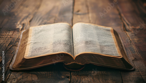 © Oleksiy, Obraz premium Open Bible on wooden table, closeup. Christian religious book