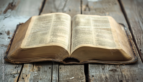 © Oleksiy, Obraz premium Open Bible on wooden table, closeup. Christian religious book