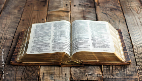 © Oleksiy, Obraz premium Open Bible on wooden table, closeup. Christian religious book