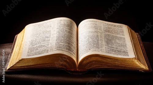 Obraz premium Open bible with gilded pages resting on a dark surface in soft light. Religious study or devotion concept for spirituality and education.