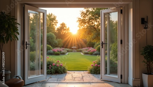© miss irine, Naklejka premium Open bifold doors frame beautiful summer garden at sunset. Golden hour sun shines on green lawn, blooming pink flowers, trees. Bird bath stands in peaceful backyard scenery from home, creating