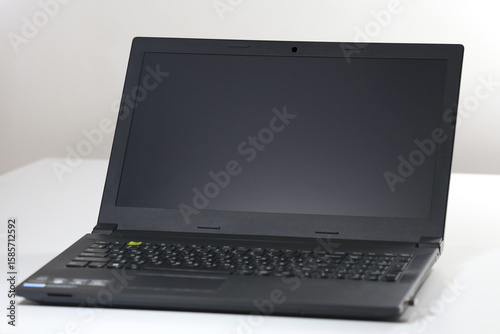 Fototapeta premium Open black laptop with a blank screen placed on a white surface. Portable...