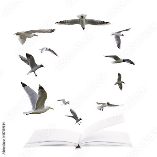 © Alexander Potapov, Obraz premium open blank book and flying seagulls isolated on white