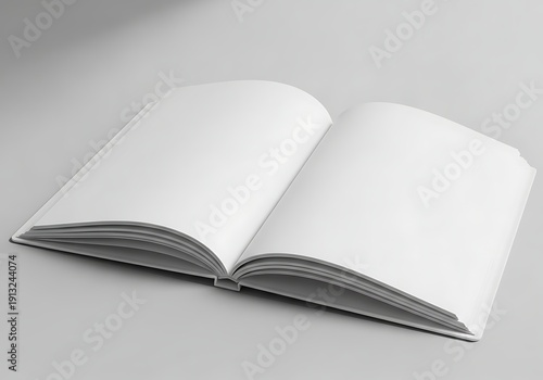 © Takia, Fototapeta premium Open blank book on a gray surface, ideal for education or reading concepts