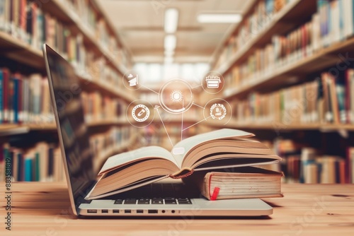© Ilja, Fototapeta premium Open Book And Laptop On Wooden Table With Icons, Education And E-Learning Concept In Library