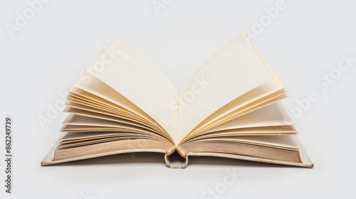 Fototapeta premium Open book blank pages displayed against plain white background, presenting...