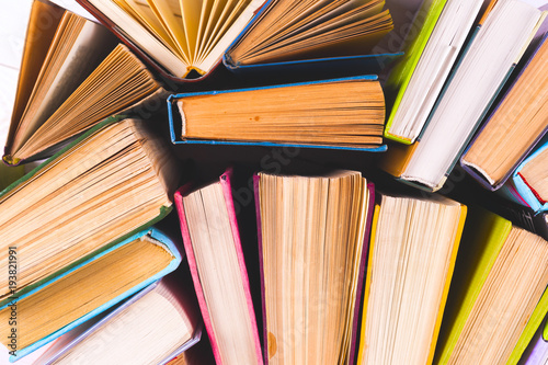 © Liudmyla V, Fototapeta premium Open book, hardback books on bright colorful background.