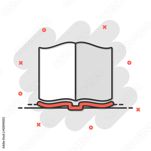 © Lysenko.A, Fototapeta premium Open book icon in comic style. Literature vector cartoon illustration on white isolated background. Library business concept splash effect.
