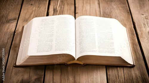 © Siasart Stock, Fototapeta premium Open Book Lies on Rustic Wooden Table, Showcasing Text and Binding Details.
