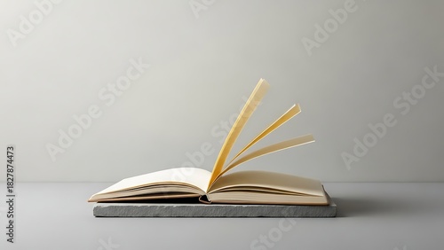 © SRI REJEKI, Obraz premium Open book on a gray surface, pages turning.