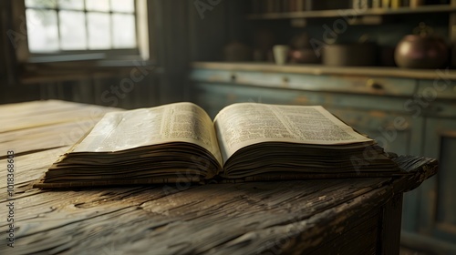 © Sri, Obraz premium Open Book on Rustic Wooden Table
