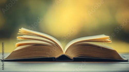 © vadosloginov, Obraz premium Open book on table in serene outdoor garden setting