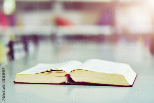 © Anurak, Obraz premium Open book on the table in the library