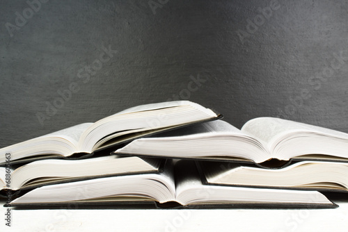 © lana_u, Obraz premium Open book on wooden deck table and black board background. Back to School. Education concept with copy space for your ad text.