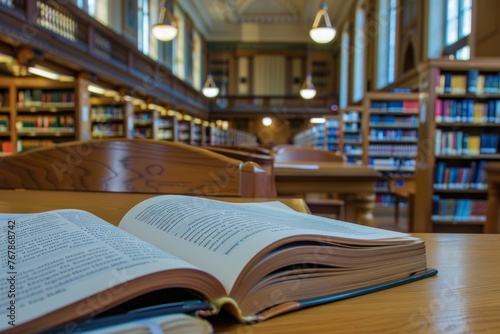 © Dzmitry, Fototapeta premium Open book on wooden table in library with blur bookshelf background. Education concept.
