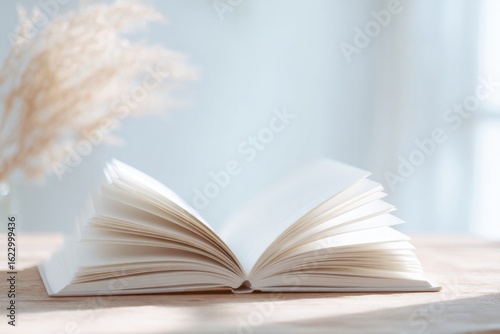 Obraz premium Open book on wooden table, sunlight streaming through window, so
