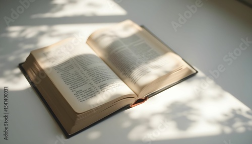 Obraz premium Open book resting on a table with soft shadows and natural light filtering...