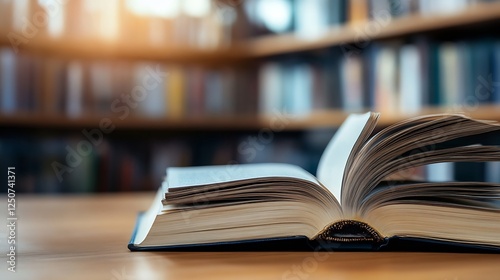 Fototapeta premium Open book resting on a wooden table with a soft focus library background :...