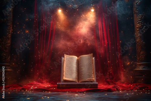 © QuantumMuse, Fototapeta premium Open book surrounded by magical atmosphere and dramatic lighting in a theatrical setting