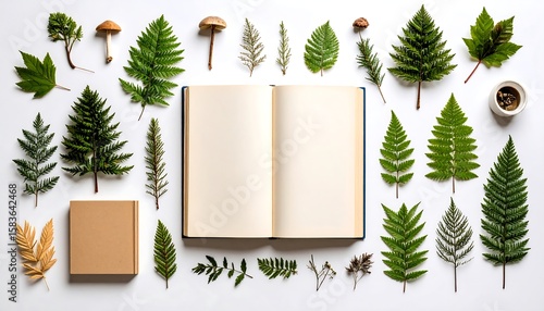 © Berkah7, Fototapeta premium Open book surrounded by pressed leaves and fungi