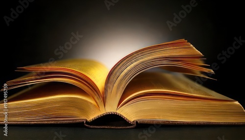 © Gold D, Fototapeta premium Open book with illuminated pages against a dark background.