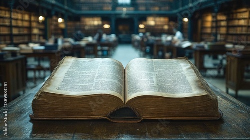 © Nonot, Obraz premium Open Book with Library Interior.