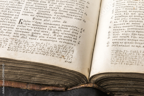 Obraz premium Open book with light spotlight on text. Reading of opened book educate reader. Ancient Bible text reading on black background. Russian bible