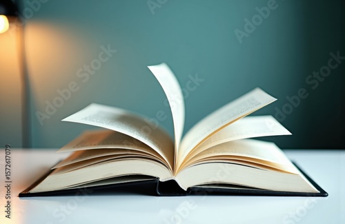 © starush, Obraz premium Open book with pages flipping in a cozy indoor setting
