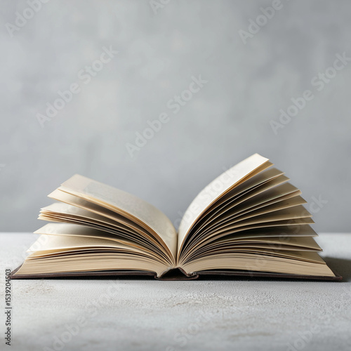 © MariAnnaCreative, Fototapeta premium Open book with pages flying against gray wall