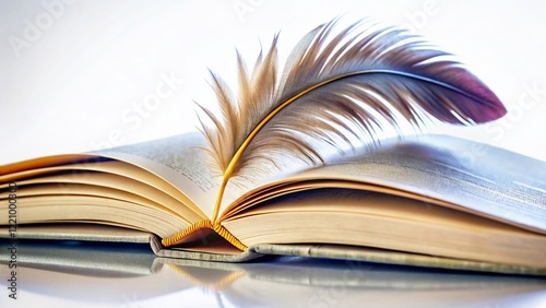 © Arnada, Fototapeta premium Open Book with Single Feather, Isolated on White Background - Knowledge, Wisdom, Reading Concept